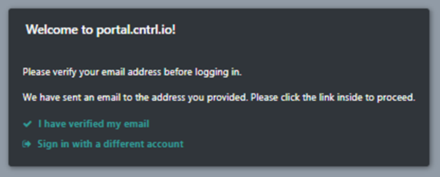 If no email arrives in 10-15 minutes and you have checked your spam folder please email support@cntrl.io and we can assist by manually verifying your email.