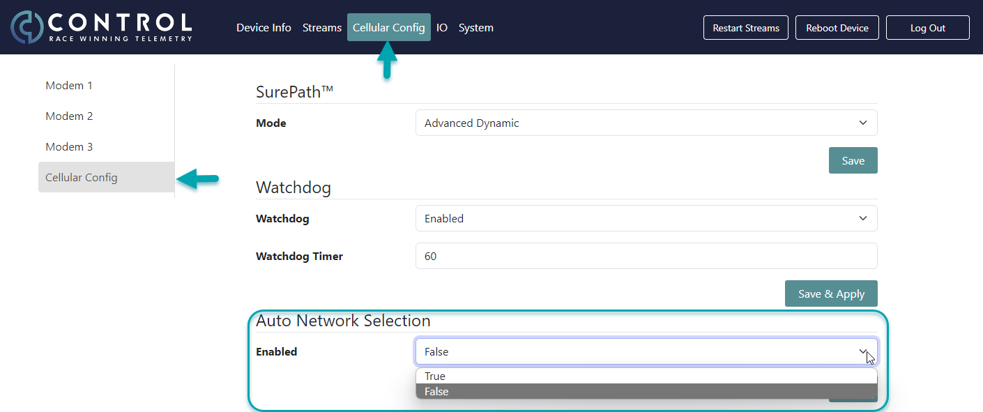 If you wish to use the Auto Network Selection navigate to Cellular Config and Cellular Config and select True for Enabled under Auto Network Selection.