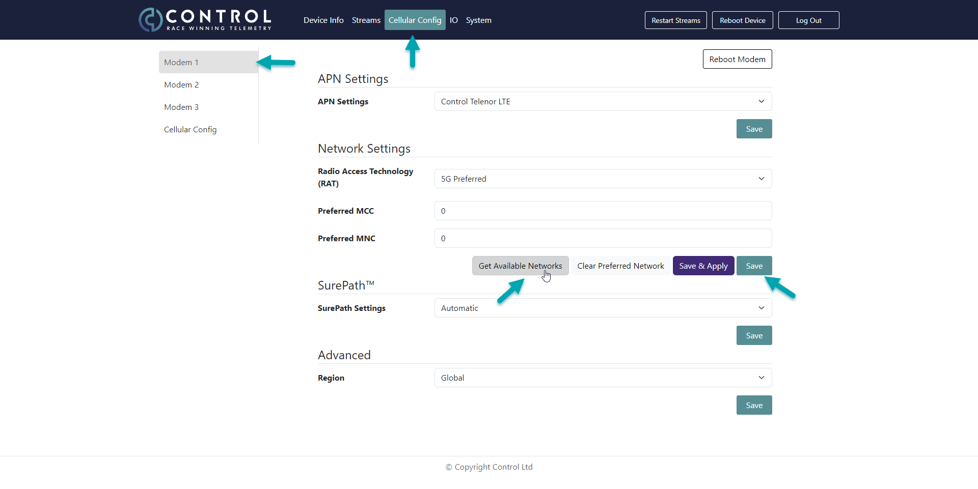 Click on the button Get Available Networks, select your preferred network in the list and click save once the network shows in the Preferred MCC and MNC windows. For changing the Modem to the network, it needs to be rebooted or by the Reboot Modem button or as well by the Reboot Device button. Rebooting the device will however stop the telemetry from all Modems for about 1 minute and data loss will occur.